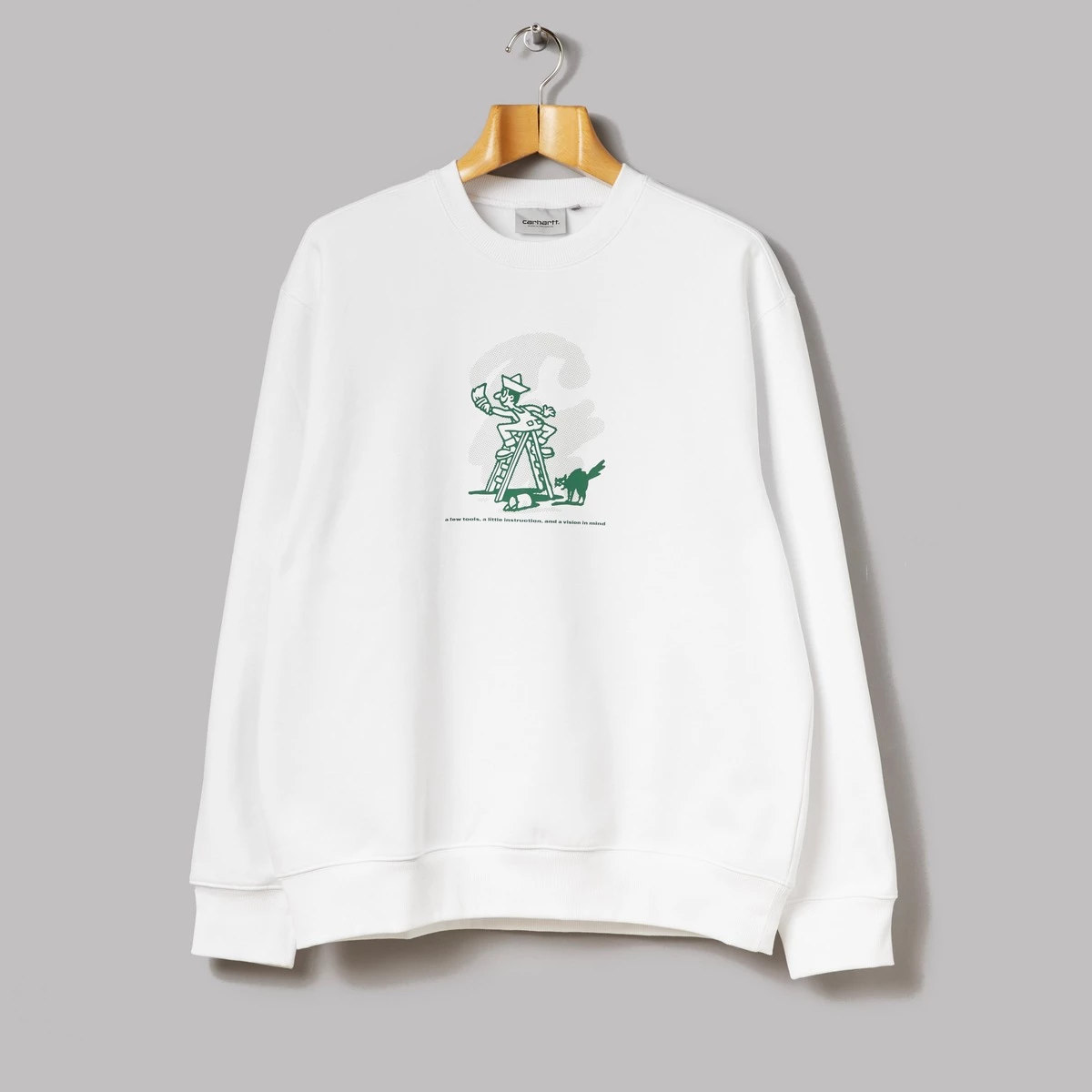 58% cotton, 42% polyester. Fleeceback fabric. Carhartt graphic print on chest and back. Ribbed cuffs and hem. Regular fit. Carhartt’s sweatwear always tends to be spot-on, so what could make it better? The answer is, of course, a graphic print of a chipper-looking painter and his freaky feline friend on the front. Which is exactly what this Lucky Painter Sweat has. Nice.