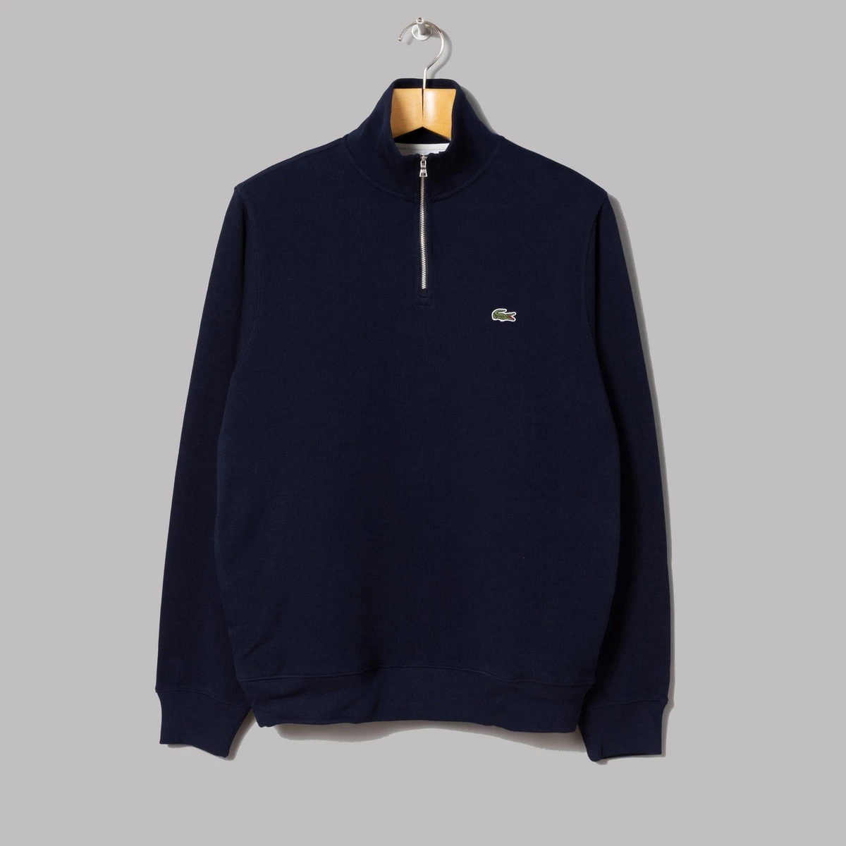 100% cotton. Ribbed cotton jersey fabric. ½ zip fastening. Ribbed cuffs and hem.Two side seam pockets. Embroidered brand patch. Regular fit. After something that you can wear on the bus, up the pub, to your second cousin twice removed’s christening, to collect a parcel from some industrial estate courier depot that you’ve never previously set foot on? Well… Introducing the Lacoste Half-Zip Sweat, the most versatile skerrick of schmut ever to enter our stockade, and thanks to that thick ribbed cotton jersey, it’s toasty too.
