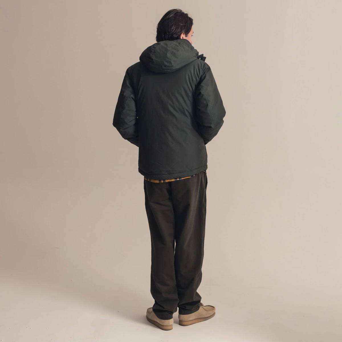 70% cotton, 30% polyester. Two-way zip with press-stud storm flap. 700 fill down. Two front pockets. Chest pocket. Sleeve pocket. Attached hood. Drawcord hem.